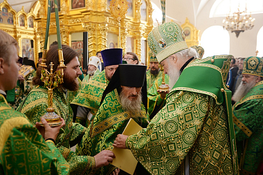 На малом входе указом Святейшего Патриарха Кирилла во внимание к усердным пастырским трудам ряд насельников и клириков Спасо-Преображенского монастыря были удостоены богослужебно-иерархических наград:
