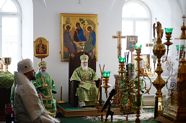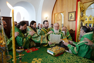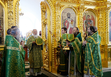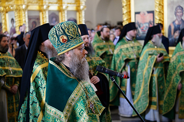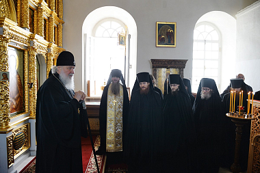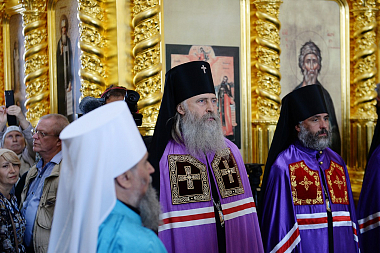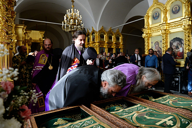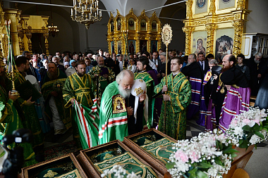 По окончании Литургии в правом приделе собора Святейший Владыка совершил славление и молитву у раки с мощами преподобных Зосимы, Савватия и Германа Соловецких.