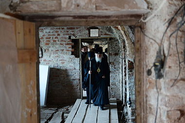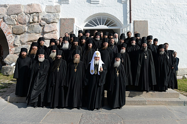 Предстоятеля Русской Православной Церкви сопровождали губернатор Архангельской области И.А. Орлов, управляющий делами Московской Патриархии митрополит Санкт-Петербургский и Ладожский Варсонофий, наместник Соловецкого монастыря архимандрит Порфирий (Шутов).