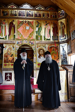 В Голгофо-Распятском скиту Святейшего Владыку встречал скитоначальник игумен Евлогий (Стручалин).