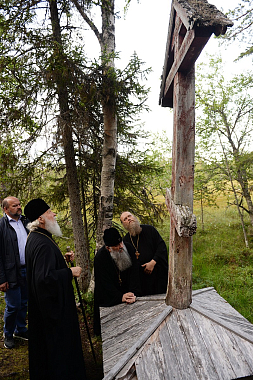 Затем Святейший Владыка посетил Троицкий скит, где осмотрел один из немногих старинных поклонных крестов на архипелаге. Большая часть из них была уничтожена в советское время. Как свидетельствует надпись на кресте, он был установлен в октябре 1917 года. Святейший Патриарх и сопровождающие пропели величание кресту.