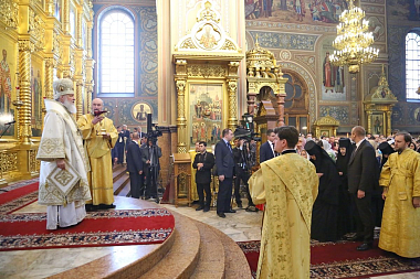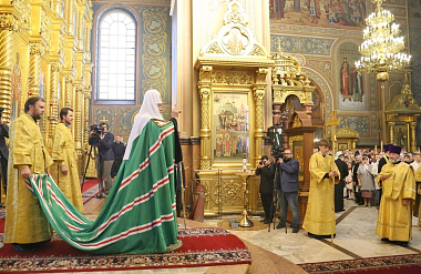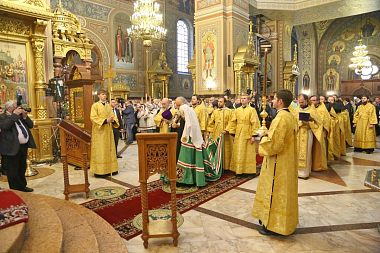 По прибытии в собор Предстоятель Русской Православной Церкви вознес молитву у ковчега с частицей мощей святителя Николая Чудотворца, а также поклонился честным мощам преподобного Пимена Угрешского.
