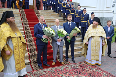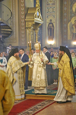 Святейший Патриарх Кирилл обратился к собравшимся с Первосвятительским словом и поздравил паству с днем памяти святителя Николая. В дар собору Святейший Владыка передал богослужебные покровцы и воздух.