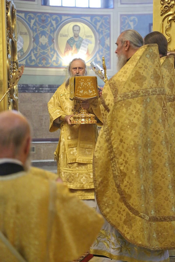 По окончании Литургии Святейший Владыка совершил славление и молитву у ковчега с частицей честных мощей святителя Николая.