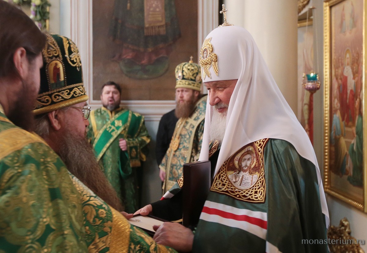 От лица братии Данилова монастыря наместник обители архимандрит Алексий (Поликарпов) приветствовал Святейшего Патриарха Кирилла и преподнес Его Святейшеству икону святого благоверного князя Иоанна Даниловича Калиты, сына святого благоверного князя Даниила.