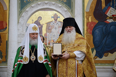 По окончании богослужения Святейшего Патриарха Кирилла приветствовала игумения Олимпиада, которая преподнесла Его Святейшеству Смоленскую икону Божией Матери, написанную сестрами обители.