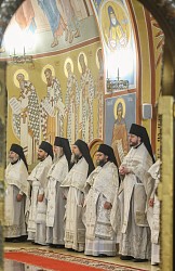 За Литургией молились участники заседания монашеского направления XXXII Международных Рождественских образовательных чтений ‒ игумены и игумении, насельники монастырей.