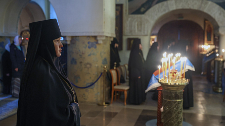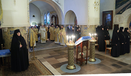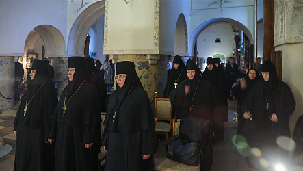 За Литургией молились настоятельница Марфо-Мариинской обители милосердия игумения Елисавета (Позднякова), заместитель председателя Синодального отдела по монастырям и монашеству, настоятельница Зачатьевского ставропигиального женского монастыря игумения Иулиания (Каледа), настоятельница Богородице-Рождественского ставропигиального женского монастыря игумения Викторина (Перминова), наместники и игумении, приехавшие в Марфо-Мариинскую обитель, чтобы принять участие в Собрании.
