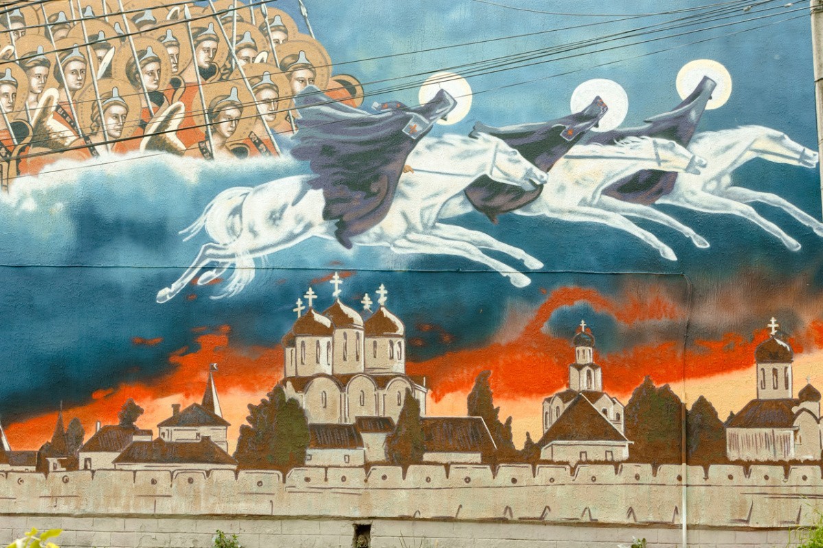 За основу мурала взяли картину Михаила Нестерова «Всадники», которая была написана в 1932 году. Сюжет картины отображает чудесное историческое событие в Троицкой обители в XVII веке. Во время осады монастыря польско-литовскими войсками преподобный Сергий явился во сне одному из иноков и сказал, что посылает в обитель подмогу. Той же ночью и интервенты, и защитники Лавры увидели троих всадников с нимбами. Этими всадниками были ученики преподобного Сергия Радонежского Михей, Варфоломей и Наум. Их появление сопровождалось звуком несущейся конницы, что напугало вражеские отряды. Польско-литовские войска сняли осаду и отошли от стен монастырской крепости.