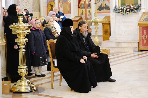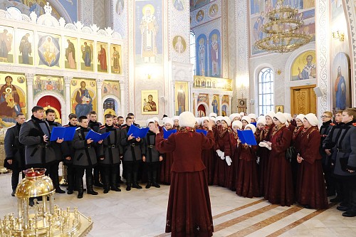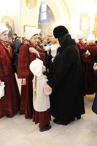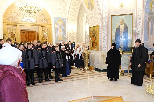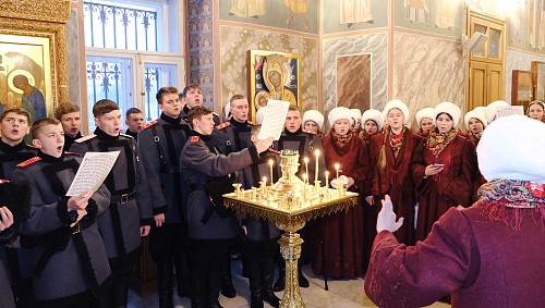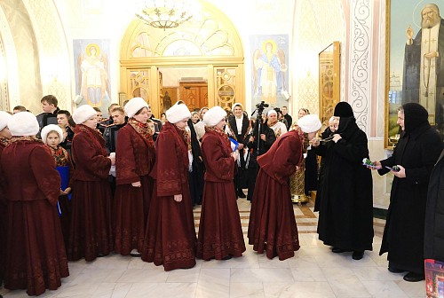 В Никольском соборе обители гостей встретила настоятельница монастыря игумения Олимпиада (Баранова). Здесь ребята исполнили рождественские песнопения, колядки, военные песни для сестер монастыря, воспитанников пансиона и сотрудников. В заключение матушка игумения поблагодарила певцов и пожелала всем стать достойными сыновьями и дочерьми Отечества и своей жизнью прославить Христа.