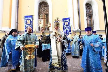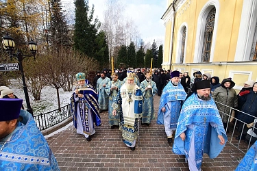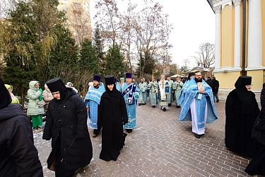 По окончании Литургии состоялся молебен и крестный ход вокруг Воскресенского собора обители. У мощей блаженной Матроны Московской владыка Феогност прочитал молитву праведной старице. На протяжении всего крестного хода духовенство окропляло многочисленных верующих святой водой.