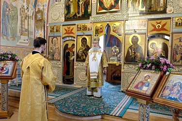 Его Высокопреосвященству сослужили штатный клирик обители протоиерей Владимир Постников и клирик Заиконоспасского мужского ставропигиального монастыря Москвы иеромонах Савва (Буханцев).