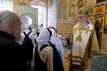 За Литургией молились заместитель председателя Синодального отдела по монастырям и монашеству, настоятельница Зачатьевского ставропигиального женского монастыря Москвы игумения Иулиания (Каледа), настоятельница Никольского Шостьенского ставропигиального женского монастыря игумения Неонилла (Фролова) с сестрами и воспитанницами монастырского пансиона, прихожане и гости обители.
