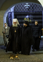 Его Высокопреосвященству сослужили наместник Андреевского ставропигиального монастыря игумен Дионисий (Шлёнов), братия обители в священном сане.