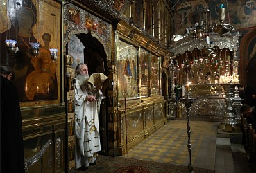Богослужебные песнопения исполнил хор Троицкого собора Лавры.