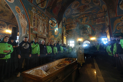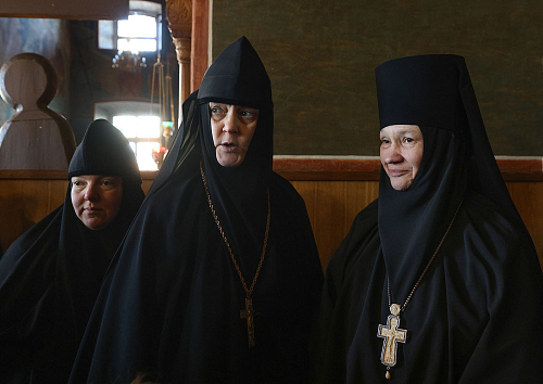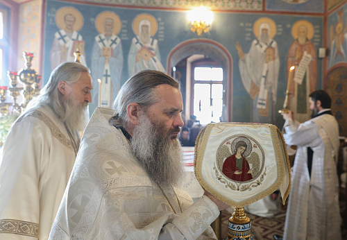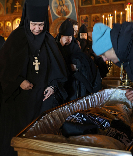 За богослужением молились заместитель председателя Синодального отдела по монастырям и монашеству, настоятельница Зачатьевского ставропигиального женского монастыря игумения Иулиания (Каледа), настоятельница Казанской Амвросиевской ставропигиальной женской пустыни в селе Шамордино Калужской области игумения Сергия (Щербакова), настоятельница женского монастыря в честь святых Жен-мироносиц в селе Клыково Калужской области игумения Иоанна (Павлова).