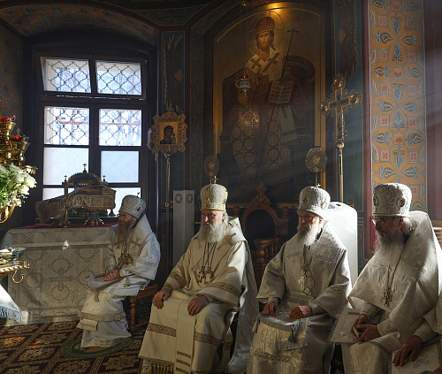За Литургией Его Высокопреосвященству сослужили митрополит Саранский и Мордовский Зиновий, наместник Оптиной пустыни епископ Можайский Иосиф, пресс-секретарь Синодального отдела по монастырям и монашеству, настоятель московского подворья Оптиной пустыни архимандрит Мелхиседек (Артюхин), настоятель Курской Коренной Рождества Пресвятой Богородицы мужской пустыни игумен Серафим (Котельников), настоятель Введенского Макарьевского Жабынского мужского монастыря игумен Назарий (Рыпин), братия Оптиной пустыни в священном сане.
