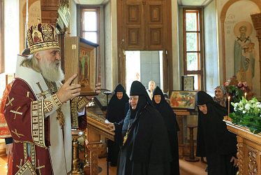 Митрополит Феогност передал матушке игумении поздравление от Святейшего Патриарха Московского и всея Руси Кирилла и обратился к присутствующим с архипастырским словом.