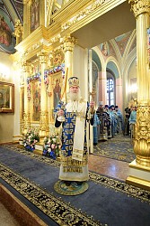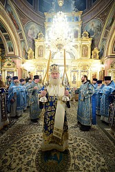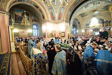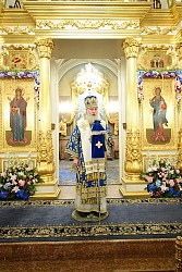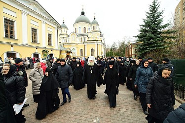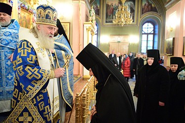 По прибытии в обитель архипастырь поклонился честным мощам блаженной Матроны Московской, а затем возглавил позднюю Божественную литургию в Воскресенском соборе обители.