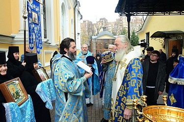 Его Высокопреосвященству сослужили протопресвитер секретарь Патриарха Московского и всея Руси по г. Москве Владимир Диваков, благочинный Покровского церковного округа г. Москвы протоиерей Олег Егоров, духовенство обители.