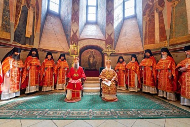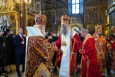 В Успенском соборе Святейший Патриарх Кирилл и Святейший Патриарх Порфирий совершили Божественную литургию.