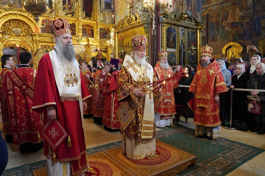 За Литургией Святейшим Патриархам сослужили: митрополит Воскресенский Григорий, управляющий делами Московской Патриархии, первый викарий Патриарха Московского и всея Руси по г. Москве, наместник Новоспасского ставропигиального монастыря; архиепископ Новосадский митрополит Бачский Ириней; митрополит Каширский Феогност, председатель Синодального отдела по монастырям и монашеству, наместник Донского ставропигиального монастыря; епископ Ремезианский Стефан; архиепископ Одинцовский и Красногорский Фома, руководитель Административного секретариата Московской Патриархии; епископ Павлово-Посадский Силуан, заместитель управляющего делами Московской Патриархии; епископ Сергиево-Посадский и Дмитровский Кирилл; епископ Раменский Алексий, личный секретарь Святейшего Патриарха Кирилла; архимандрит Макарий (Веретенников), доктор церковной истории, насельник Троице-Сергиевой лавры; архимандрит Харитон (Павлица), настоятель Ковильского монастыря Бачской епархии Сербской Православной Церкви; протоиерей Николай Балашов, советник Патриарха Московского и всея Руси; протоиерей Игорь Якимчук, заместитель председателя ОВЦС МП; архимандрит Диодор (Дидковский), насельник Троице-Сергиевой лавры; протоиерей Георгий Стоисавлевич, шеф Кабинета Патриарха Сербского; игумен Дионисий (Шлёнов), наместник Андреевского ставропигиального монастыря; архимандрит Захария (Шкурихин), насельник Троице-Сергиевой лавры; насельники Троице-Сергиевой лавры в священном сане, сербское духовенство – члены делегации и духовенство г. Москвы.