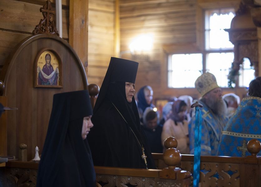В 1910 году игумения Мария, по благословению сщмч. Владимира (Богоявленского), приступает к строительству деревянного храма. Храм, так же как и весь ансамбль построек на хуторе, был возведен по проекту известного церковного архитектора А.А. Латкова в стиле «русский модерн». 16 мая 1911 года церковь Покрова Пресвятой Богородицы была освящена и вскоре стала любимейшим местом молитвенной отрады и утешения для монастырских сестер и жителей окрестных деревень.