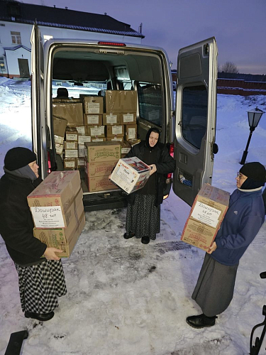 Потом монахиня Ювеналия с протоиереем Константином и помощниками приехали в Свято-Успенский Николо-Васильевский монастырь, которому оказывается помощь уже не первый год и с которым Крестовоздвиженская обитель имеет духовную связь. С помощью волонтеров народного фронта и сборов Полины Цветковой (телеведущей первого канала), в монастырь была передана Газель с медикаментами, одеялами, подушками и мотоблоком. От Крестовоздвиженского Иерусалимского женского монастыря – продукты питания, теплые носки и варежки, 70 рождественских подарков, 120 сладких наборов и 100 детских раскрасок и фломастеров.