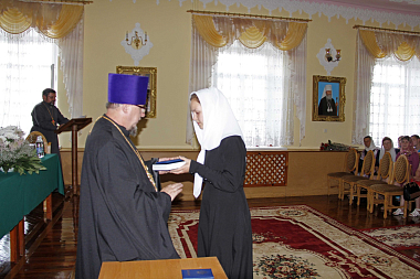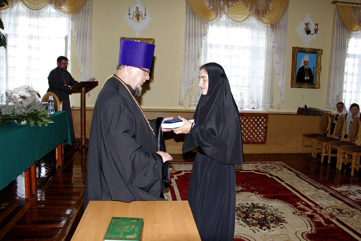 По прочтении доклада ректор РКДУ протоиерей Александр Опанасюк вручил дипломы двенадцати выпускницам Регентского отделения, в числе которых две насельницы Корецкой обители, и четырем выпускницам швейного отделения.