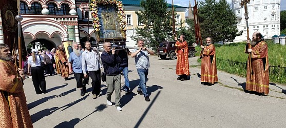 После Божественной литургии в Введенском храме крестный ход направился в монастырь, где возле Святых ворот чтимый образ святителя Николая встречали с иконой преподобного Иосифа Волоцкого наместник Иосифо-Волоцкого монастыря архимандрит Сергий (Воронков) с братией и многочисленные паломники.