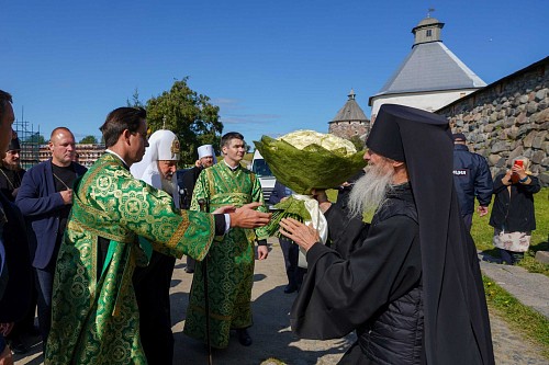 Из аэропорта Святейший Патриарх Кирилл направился в Соловецкий монастырь. У святых врат обители Предстоятеля встречали председатель Синодального отдела по монастырям и монашеству митрополит Каширский Феогност и братия обители.