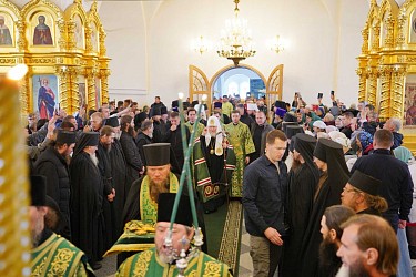 Затем Святейший Патриарх Кирилл обратился со словом к архипастырям, насельникам монастыря и паломникам: