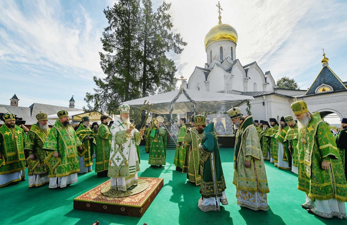 У святых врат Предстоятеля Русской Православной Церкви встречали архиереи, прибывшие на праздник в Саввино-Сторожевский монастырь, наместник обители архимандрит Павел (Кривоногов) с братией монастыря, заместитель главы администрации Одинцовского городского округа Московской области В. В. Переверзева, начальник территориального управления Звенигород администрации Одинцовского городского округа Р. Х. Мангушев.