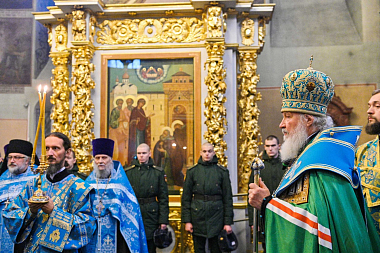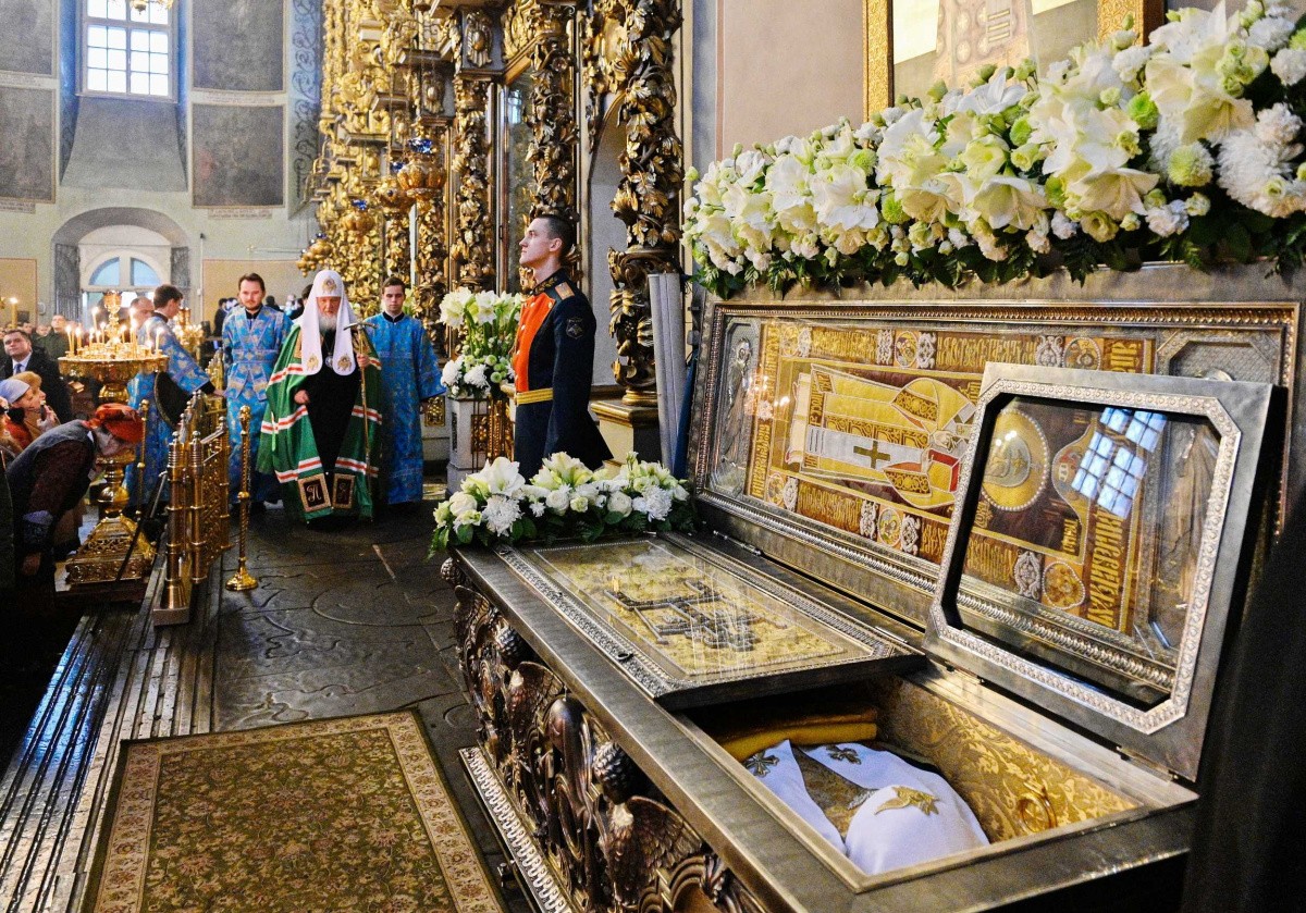 В Большом соборе обители, где покоятся честные мощи святителя Тихона, Предстоятель Русской Православной Церкви совершил молебен.