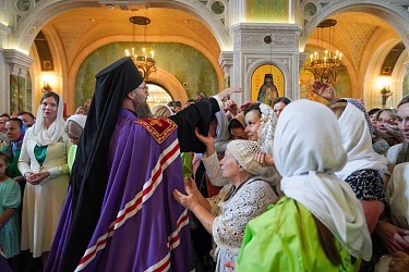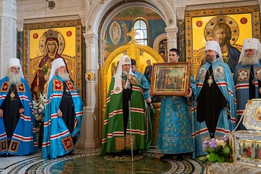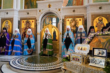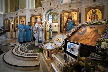 Перед богослужением состоялась торжественная встреча двух ковчегов с честными мощами двух великих русских святых – преподобной Евфросинии Полоцкой и преподобной Евфросинии Московской. Мощи преподобной Евфросинии Полоцкой принесены из Спасо-Евфросиниевского монастыря г. Полоцка (Республика Беларусь), мощи преподобной Евфросинии Московской – из кафедрального соборного Храма Христа Спасителя г. Москвы. В ближайшие недели ковчег с мощами прп. Евфросинии Полоцкой будет принесен в епархии России, а ковчег с мощами прп. Евфросинии Московской – в епархии Белорусского экзархата.