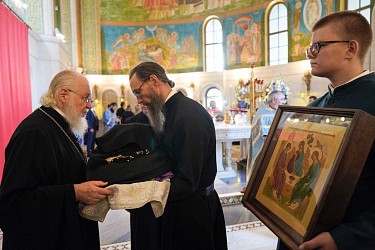 Предстоятель передал в дар Сретенскому монастырю картину с изображением святого благоверного князя Александра Невского во младенчестве, а каждому из насельников обители – сборник своих проповедей 2023 года, изданный Свято-Троицкой Сергиевой лаврой в нынешнем году.