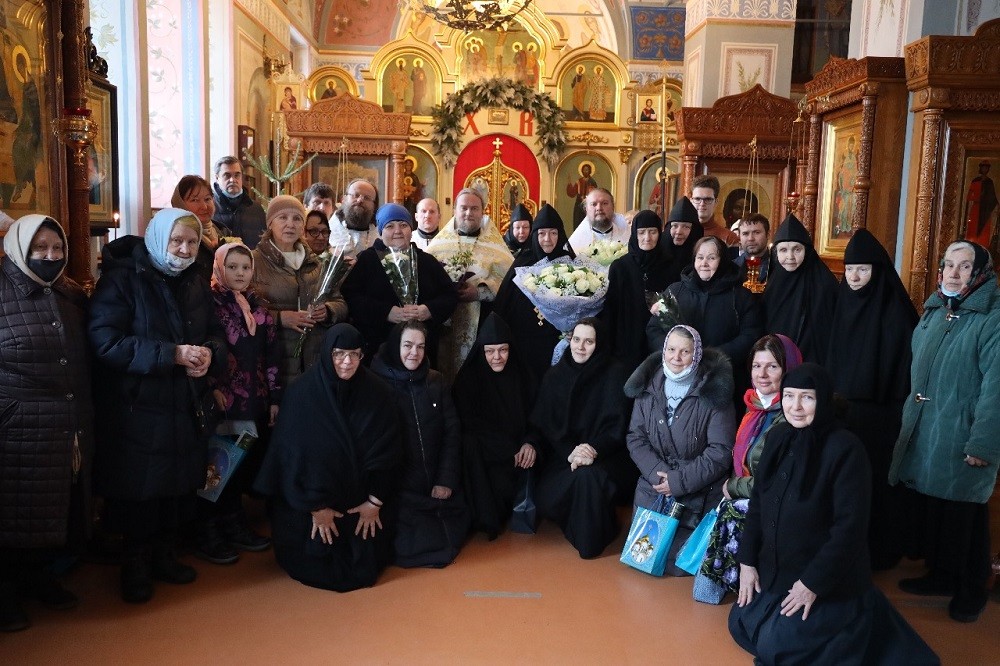 По окончании Литургии от лица духовенства и всех собравшихся, матушку игумению поздравил старший священник обители иеромонах Адриан (Чаликов).