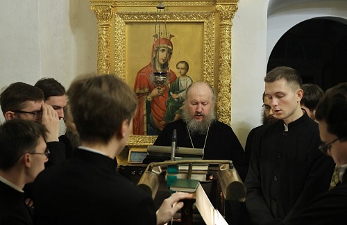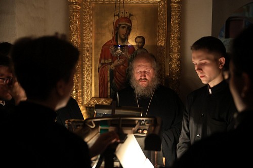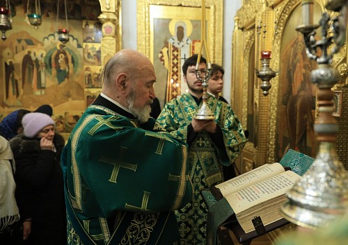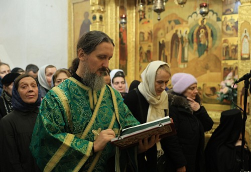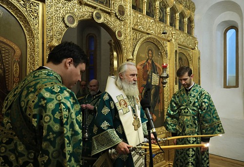 Его Высокопреосвященству сослужили пресс-секретарь Синодального отдела по монастырям и монашеству, настоятель московского подворья Введенского ставропигиального мужского монастыря Оптина пустынь архимандрит Мелхиседек (Артюхин), братия обители в священном сане.