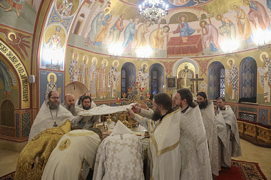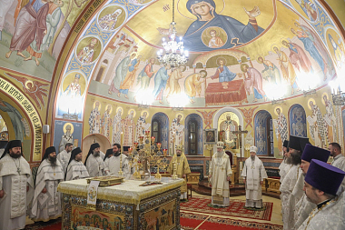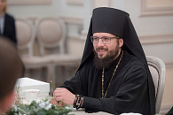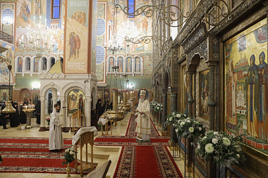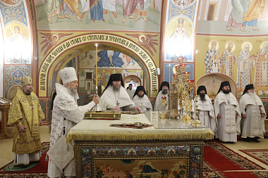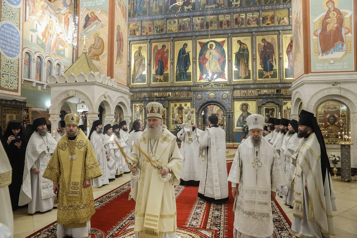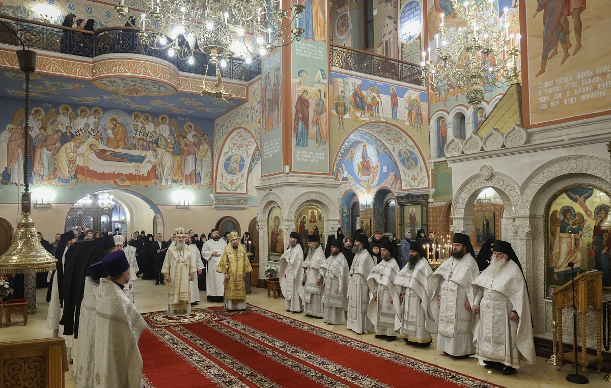 Его Высокопреосвященству сослужили митрополит Саранский и Мордовский Зиновий, епископ Сызранский и Шигонский Леонтий, участники монашеского направления Рождественских чтений в священном сане, клирики Зачатьевской обители. В алтаре молился епископ Солнечногорский Алексий, наместник Данилова ставропигиального мужского монастыря.