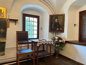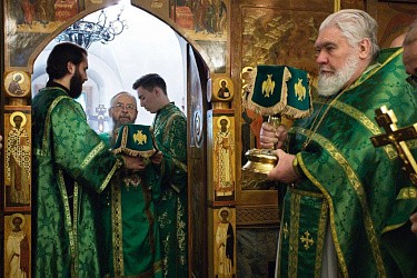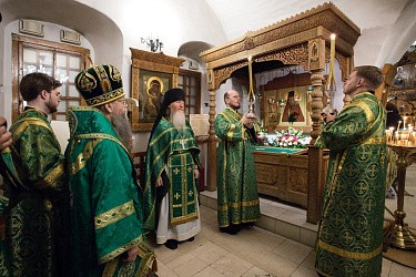 Утром в Покровском храме Даниловской обители наместник монастыря епископ Солнечногорский Алексий отслужил Божественную литургию и совершил славление у раки преподобного Георгия. На богослужении пел хор монастыря. Затем владыка Алексий посетил недавно открытую мемориальную келью преподобного.