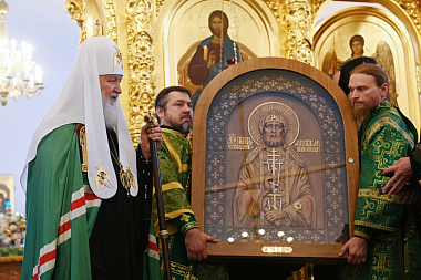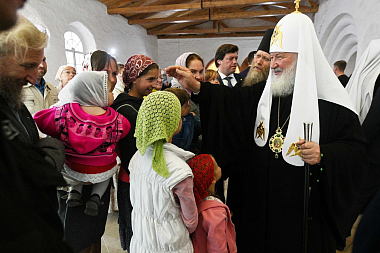 В дар обители Святейший Патриарх передал резную икону преподобноисповедника Ираклия Иссык-Кульского с частицей мощей. «Образ выполнен в резьбе по дереву, то есть в том стиле, который очень близок к православной культуре Севера. Хотел бы, чтобы этот образ с частицей мощей преподобного находился в этой святой обители», – сказал Святейший Владыка.