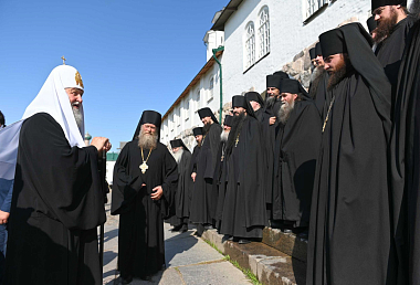 Святейший Патриарх Кирилл поблагодарил наместника обители архимандрита Порфирия за труды и вручил ему юбилейный крест, изготовленный к 10-летию Поместного Собора Русской Православной Церкви 2009 года и интронизации Его Святейшества.
