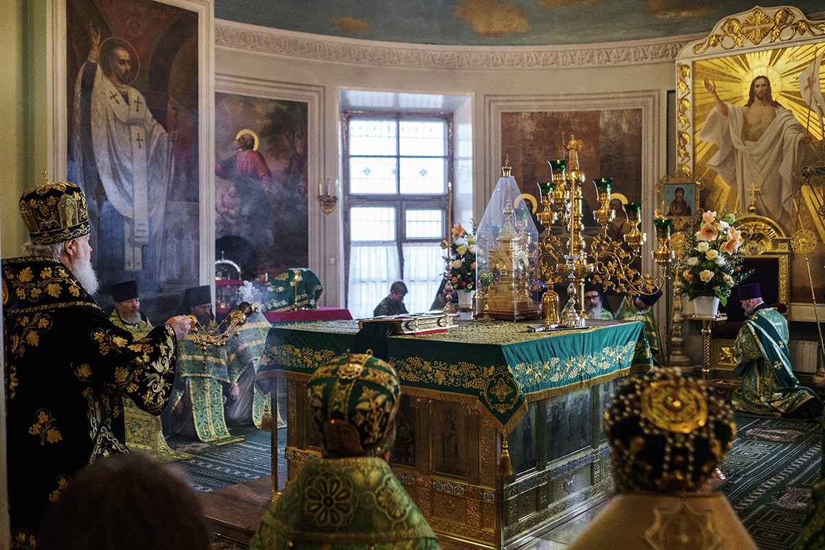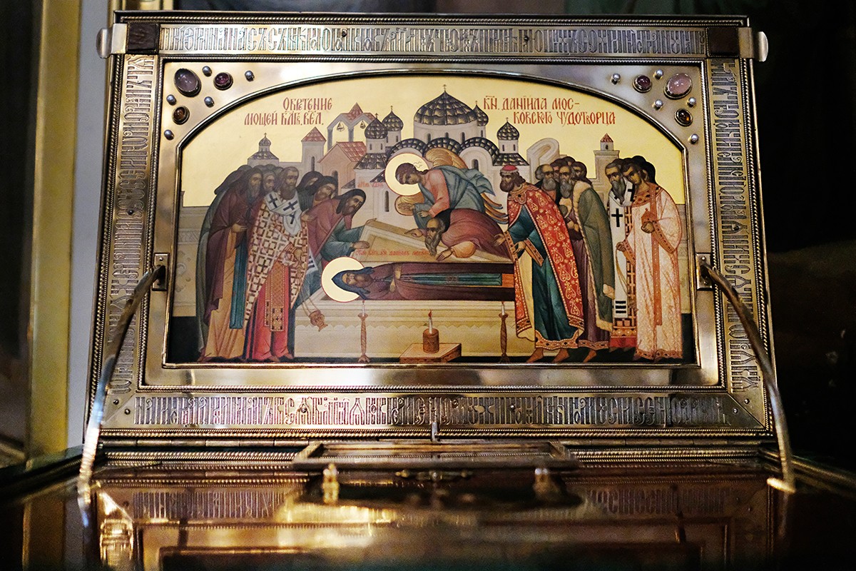 По окончании Литургии Святейший Патриарх Кирилл совершил славление у ковчега с частицей честных мощей святого благоверного князя Даниила.