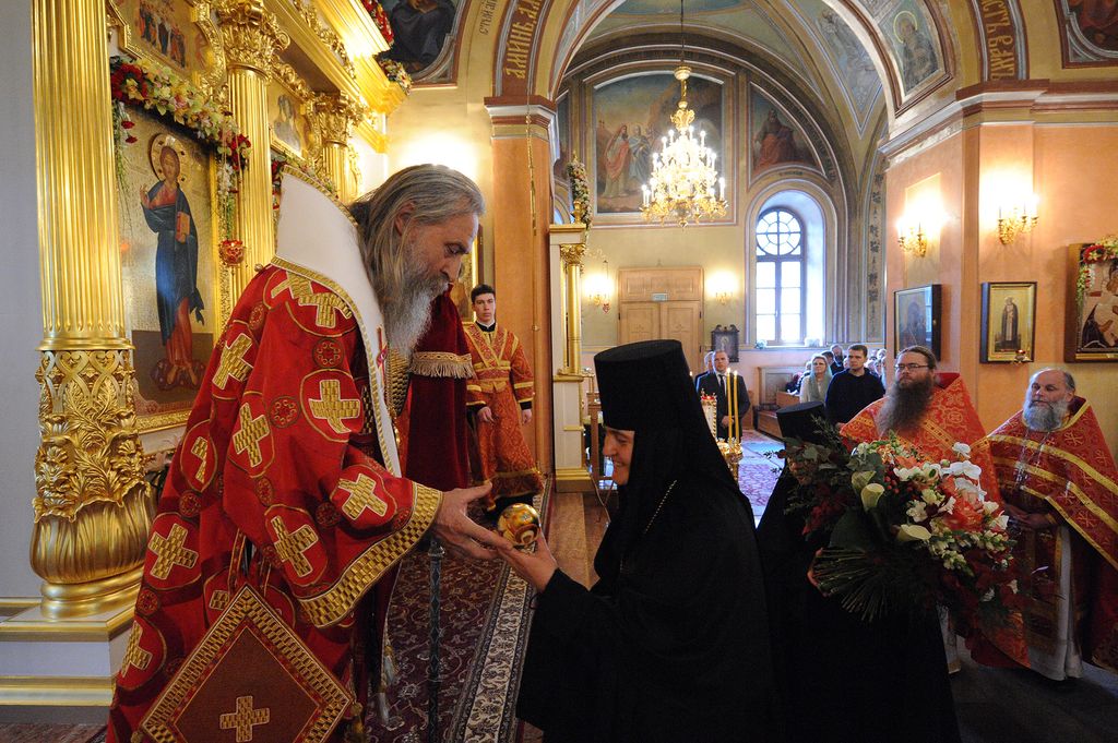 Затем игумения Феофания преподнесла в дар Его Высокопреосвященству расписное пасхальное яйцо.