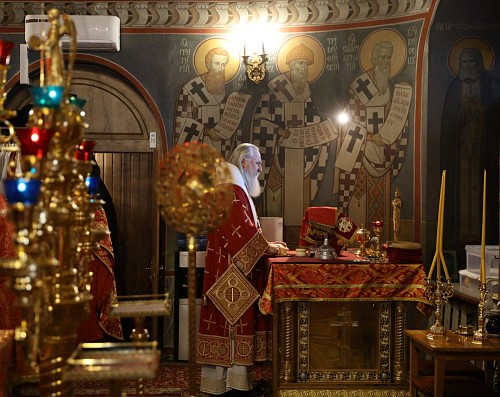 Его Высокопреосвященству сослужили временно исполняющий обязанности наместника священноинок Парфений (Леонов), братия обители в священном сане.