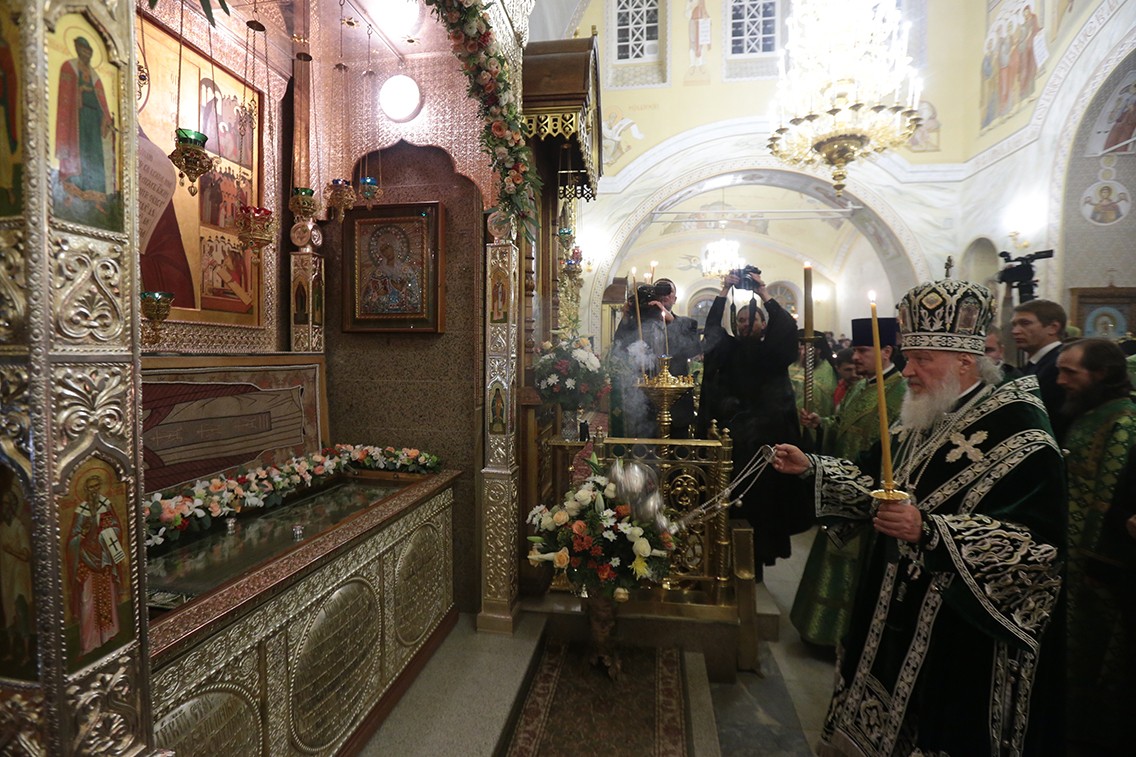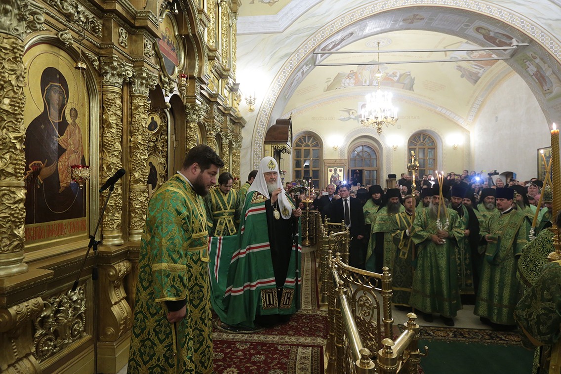 В главном храме обители – соборе в честь Введения во храм Пресвятой Богородицы, где покоятся святые мощи преподобных Амвросия и Нектария, старцев Оптинских, – Предстоятель Русской Православной Церкви совершил Всенощное бдение.