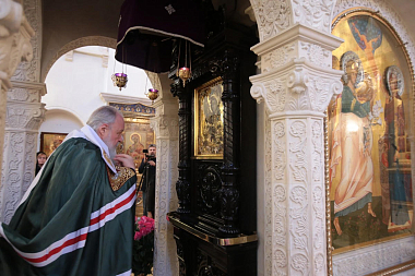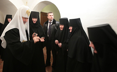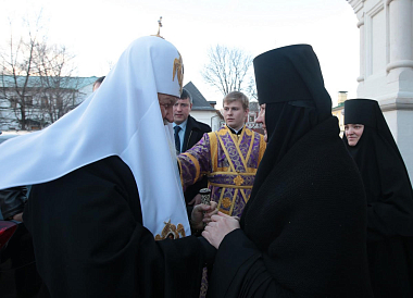 По окончании богослужения игумения Иулиания приветствовала Святейшего Владыку и преподнесла в дар Его Святейшеству Постную Триодь.