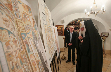 В завершение игумения Иулиания (Каледа) и заслуженный художник России В.М. Ананьев представили Его Святейшеству проект росписи стен собора Рождества Пресвятой Богородицы Зачатьевского ставропигиального монастыря.