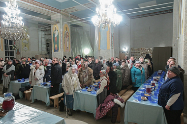Затем настоятельница монастыря с сестрами пригласили всех прихожан на праздничную трапезу, за которой Никольский хор, состоящий из прихожанок Никольского храма, исполнил песни и колядки. Ученики Воскресной школы при Шостьенском монастыре поздравили всех прихожан музыкально-поэтической композицией «Рождественский дар».