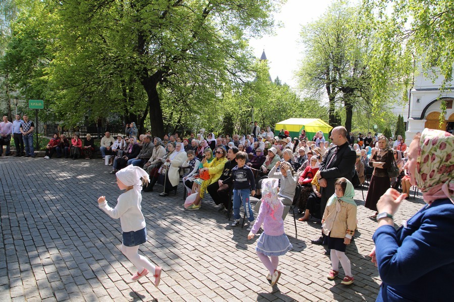 Затем начался концерт колокольных звонов. По традиции, на Светлой седмице в Новоспасский монастырь со всей Москвы и других городов съезжаются звонари. В музыку военного оркестра вливались колокольные звоны. Таким необычным образом были исполнены Тухмановский «День Победы» и «Славься».